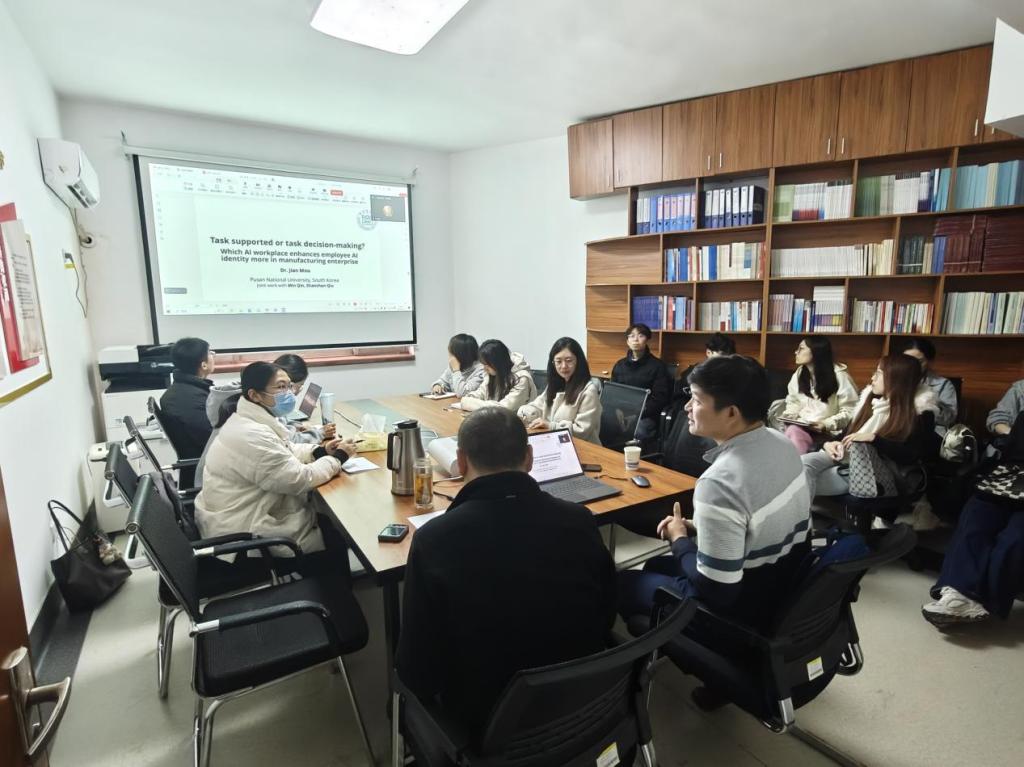 2025年11月7日下午,中心特邀韩国釜山大学商学院长聘教授、博士生导师牟健担任主讲嘉宾,作了题为“任务支持还是任务决策?制造企业中AI场景对员工人工智能身份的影响”的专题报告。中心部分教师和研究生通过线上线下方式参加了讲座。